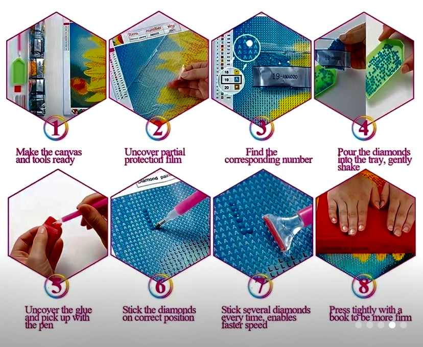 Contains all the diamonds and tools required to complete the project including a single diamond placer tool and a multi diamond placer tool to speed up the filling of large areas. Thick canvas paper. Suitable for framing once finished.